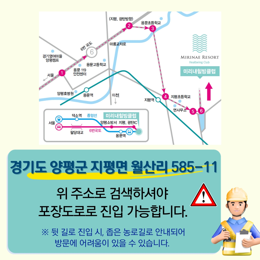 서울에서 차로 약 1시간 30분 거리에 위치한 미리내힐빙클럽은 넓은 주차장을 완비하고 있어 편리한 이용이 가능합니다.