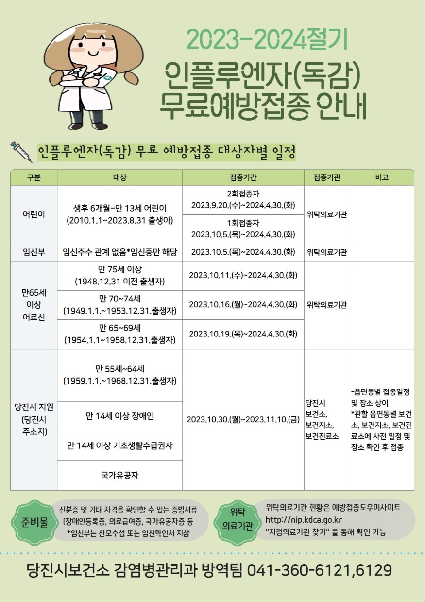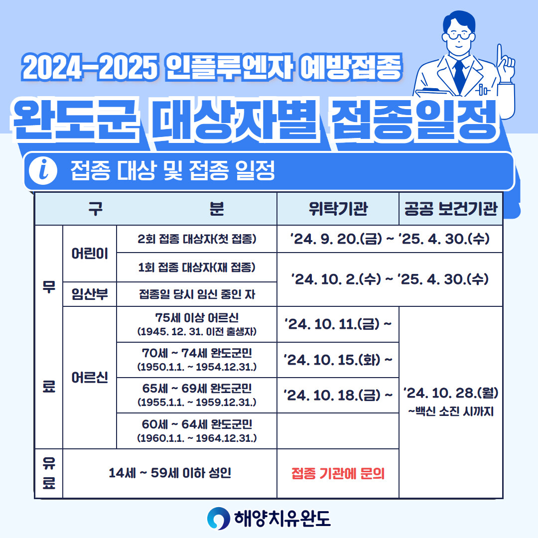 2024년 독감 예방접종 무료 접종 시기는 다음과 같습니다: