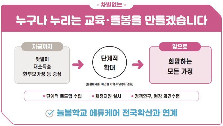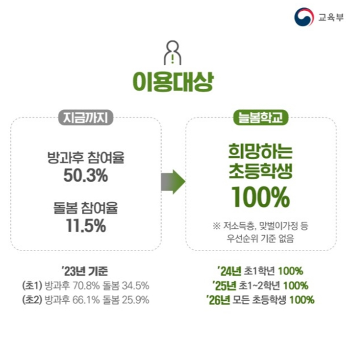 늘봄교실은 2025년부터 더욱 강화된 교육 프로그램과 AI 기반 맞춤형 학습을 제공하여, 학생들의 전인적 성장을 지원합니다. 특히 맞벌이 가정과 한부모 가정의 자녀들에게 우선적인 기회를 제공함으로써, 모든 학생들이 평등한 교육 기회를 가질 수 있도록 노력하고 있습니다.